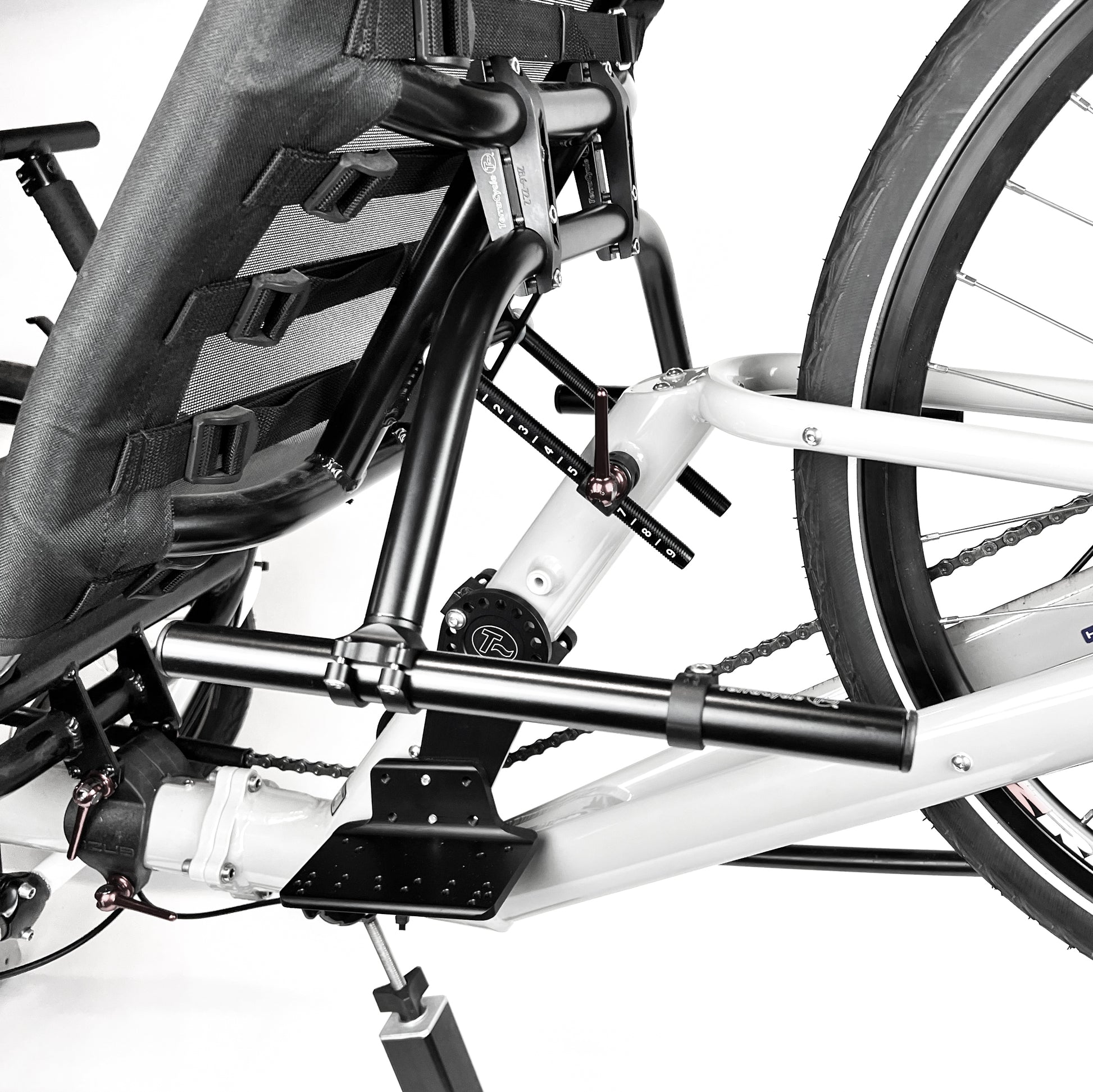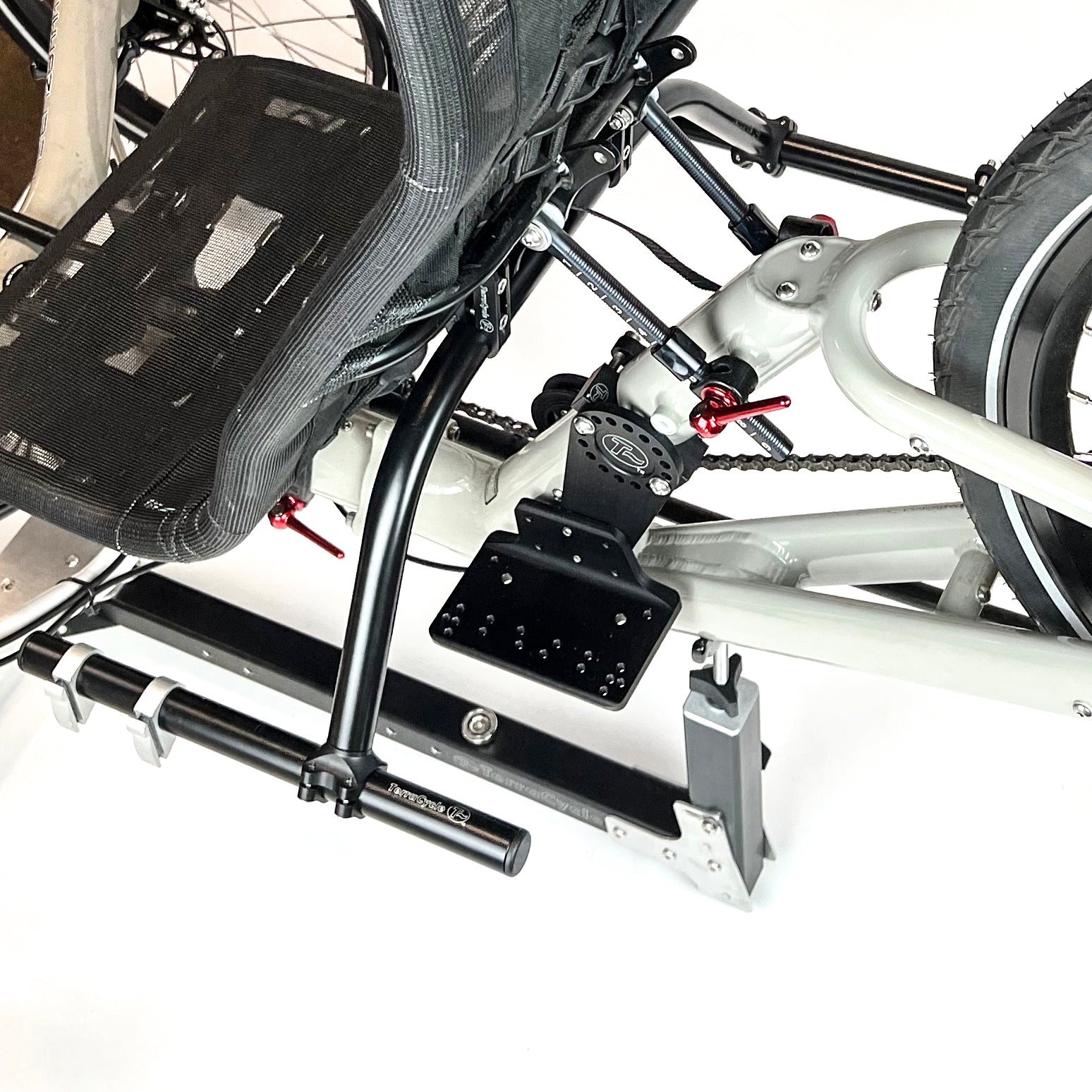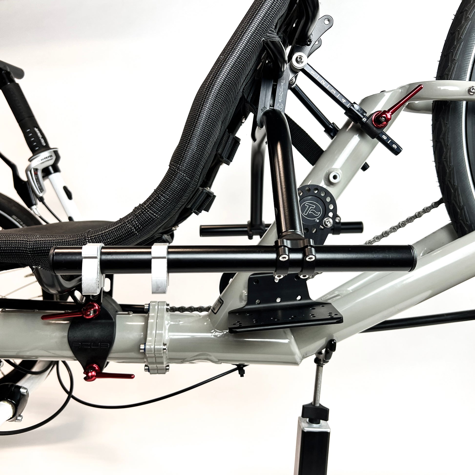 One of the great things about triking is how nice it is to have everything right at hand as you roll along. With a SeatSide mount, you can have all sorts of things close at hand. Our Azub SeatSide Mount lets you carry bags, water bottles, cameras, all sorts of things, right by your side. Snacks, phones, lip balm, you name it, now you can keep it all within reach while riding. This mount attaches to the back of the seat frame. The mount curves out and down to stay clear of the seat adjustment clamp and the rear rack; then it comes forward to your side. The SeatSide arm can be attached on either side.