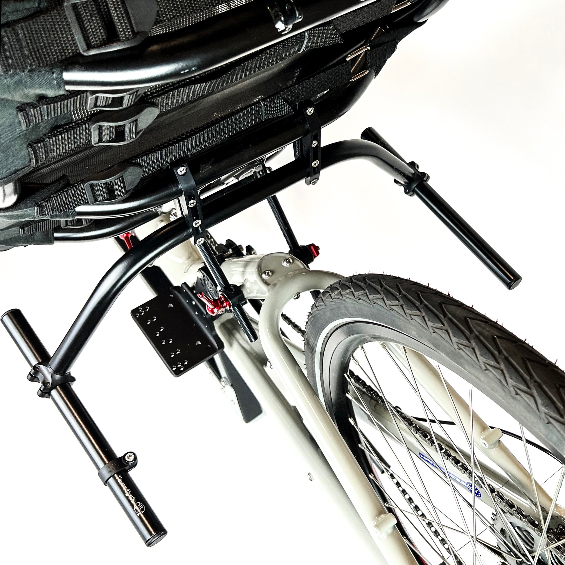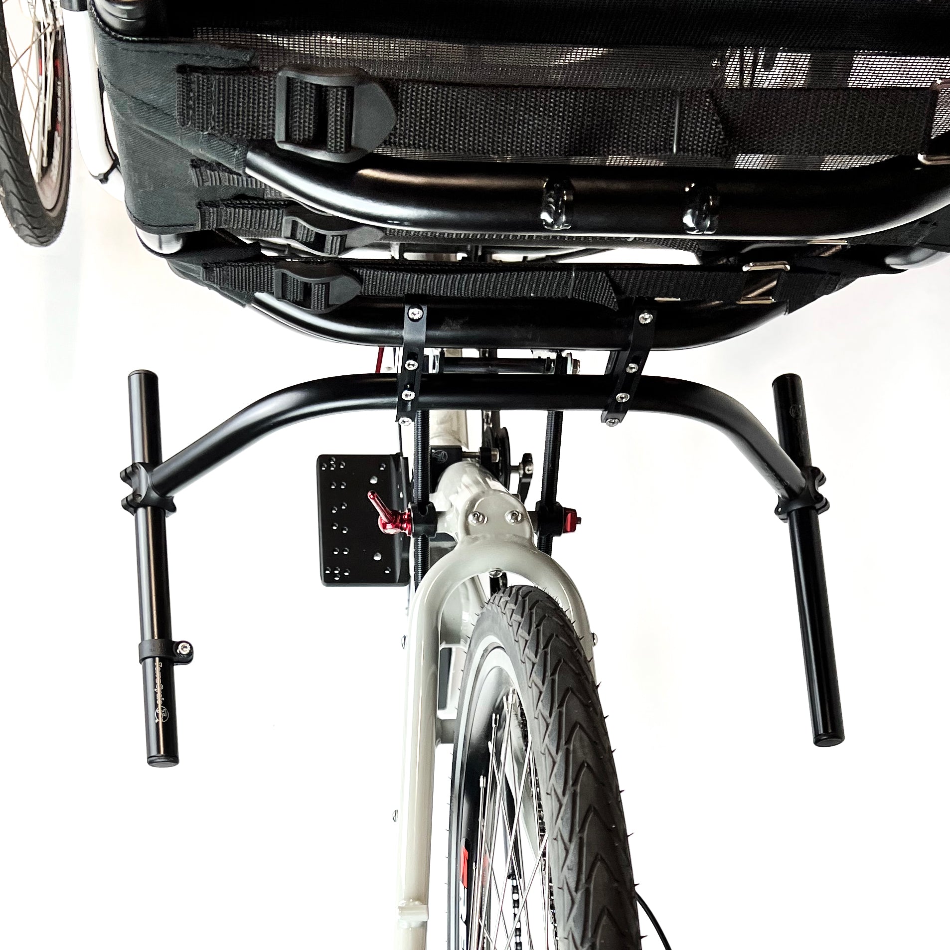 Specially machined clamps attach to the middle seat support tube, near the seat angle adjusting arms. A support tube comes out sideways and down from the seat mount clamps. The end of the support tube has a T clamp that holds a horizontal accessory mounting tube. The accessory mounting tube is long enough to hold whatever you'd like.