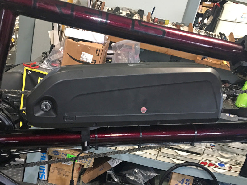 Most commonly available batteries. The battery shelf is drilled and tapped for the common batteries, like the Lunacycles, Shark, Hailong, Falco, etc.  that use standard bottle boss spacing, as well as holes for NeoDrive and GoSwiss.