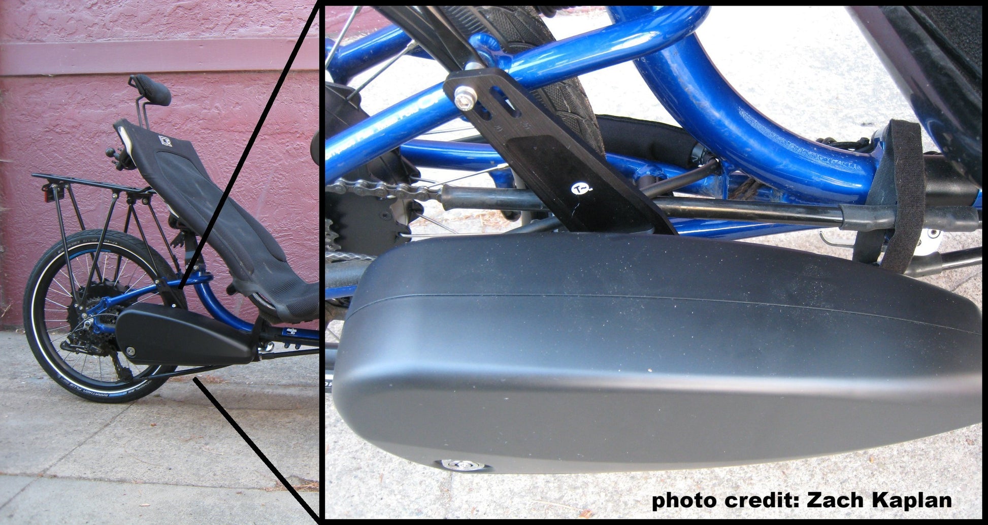 Batteries are dense and difficult to carry. This mount lets you attach your BionX, Neodrives, or other battery to your ICE trike down low and out of the way. In fact, it lets you put the battery so out of the way that you can fold the trike with the battery attached!