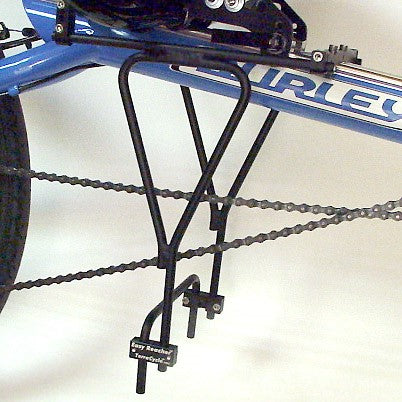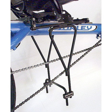 Specifically designed for Burley bikes, but also fully compatible with Edge 2 wheelers, the ultra-durable T-Cycle Burley/Edge Easy Reacher Rack is custom made and much stronger than an ordinary rack. Mounting arms are custom CNC machined for the Burley/Edge seat rail so they fit perfectly and are very secure. Racks have black anodized TIG-welded rack arms. Racks are further customized with pannier rail leveling clamps specific to the angle of your main tube. Once you see how beautiful these parts are you will appreciate the all USA made T-Cycle rack. No other rack system is anything like it.