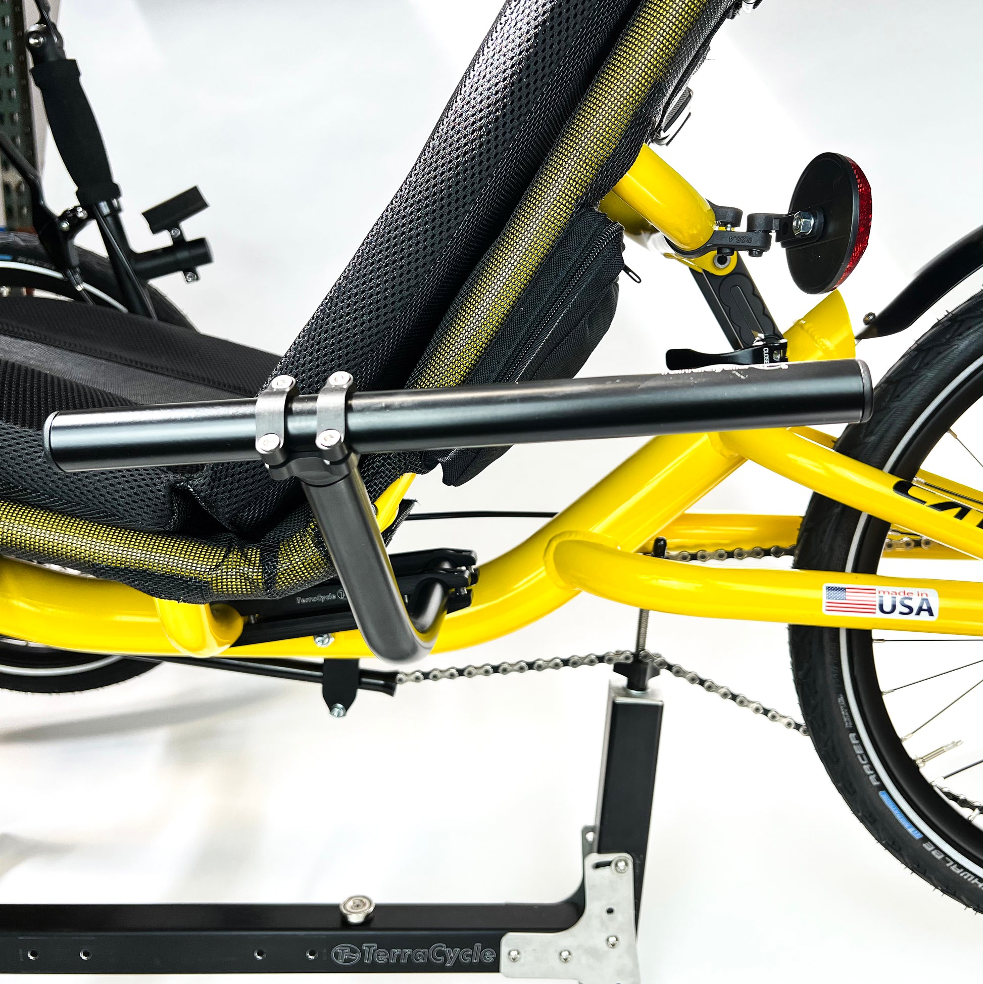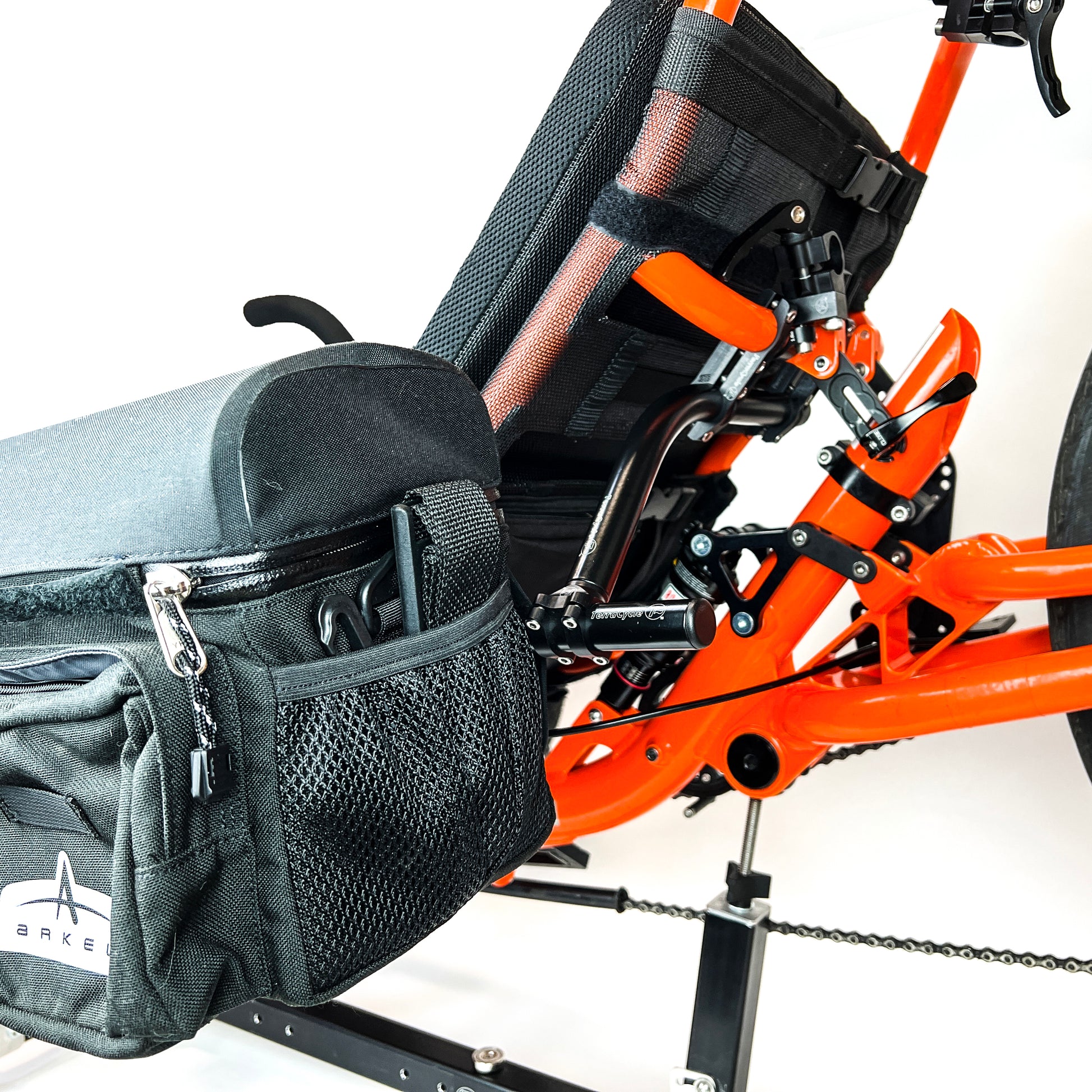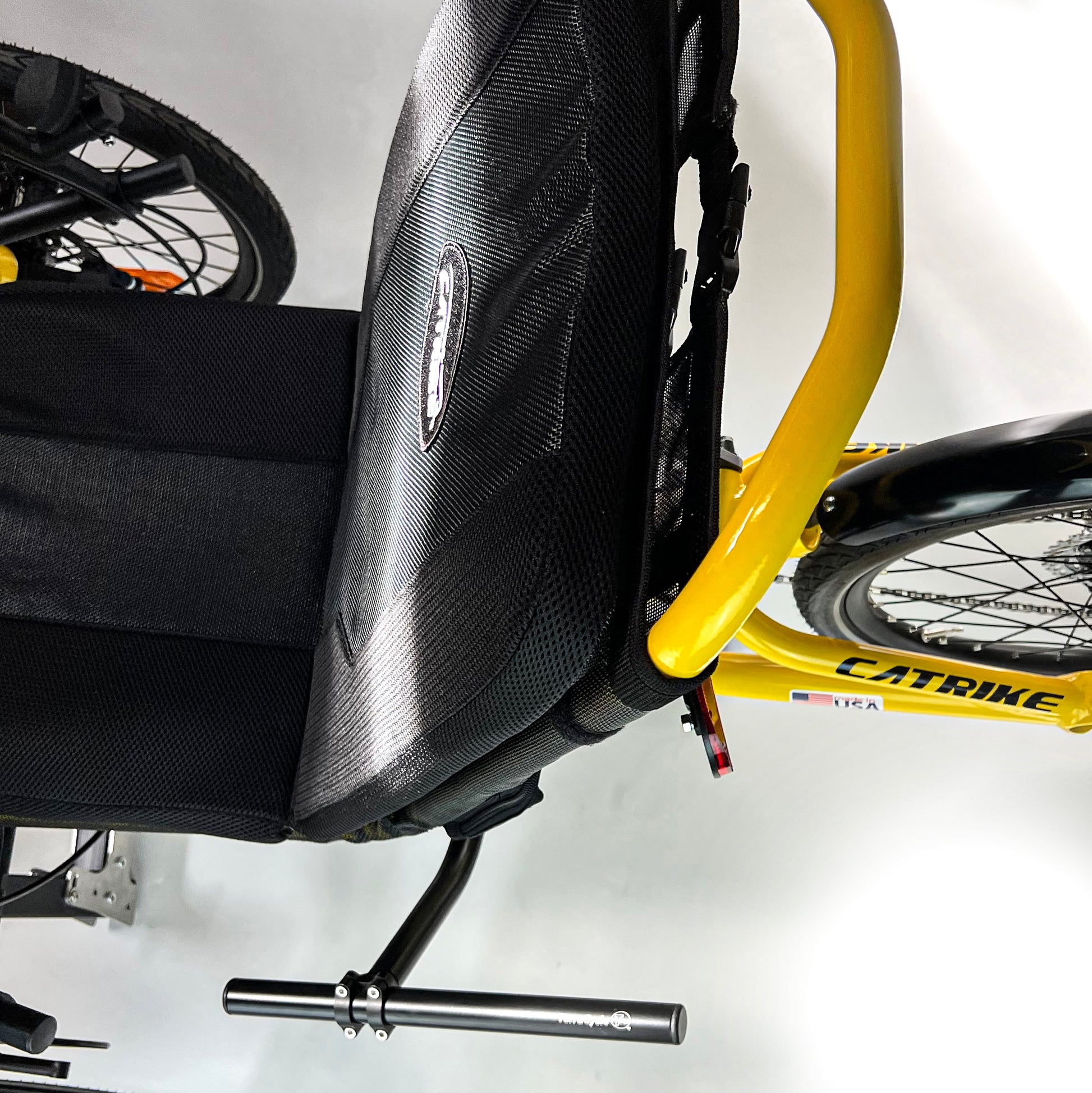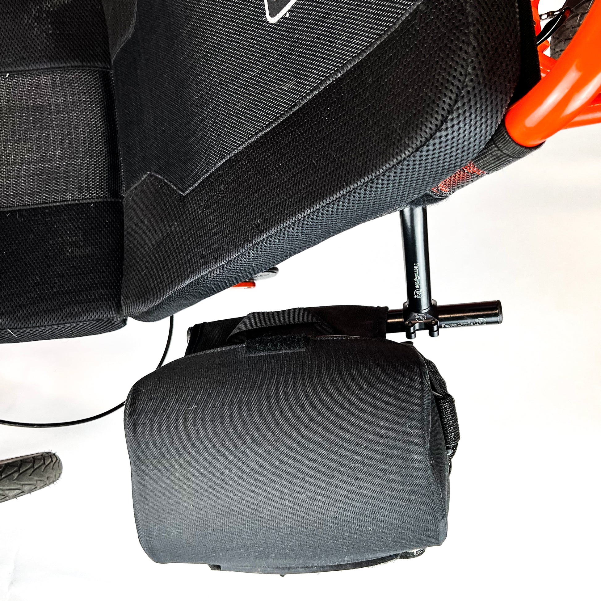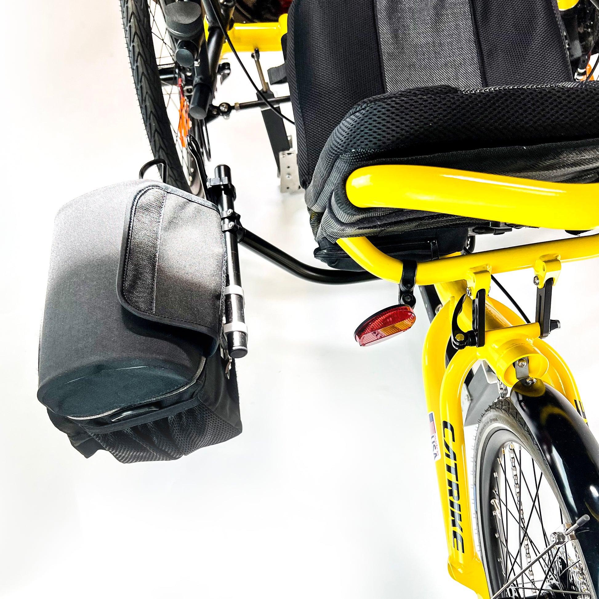 One of the great things about triking is how nice it is to have everything right at hand as you roll along. With a SeatSide mount, you can have all sorts of things close at hand. The Catrike SeatSide Mount lets you carry bags, water bottles, cameras, all sorts of things, right by your side. Snacks, phones, lip balm, you name it, now you can keep it all within reach while riding. This version of the SeatSide Mount for Catrikes attaches to the seat frame. We make other versions that attach to the main frame tube. We recommend this version of the mount for people that simply want a good sturdy place to mount things beside the seat. If you want maximum versatility in where things are located or need quick on/off removability, check out the main frame mounted version.
