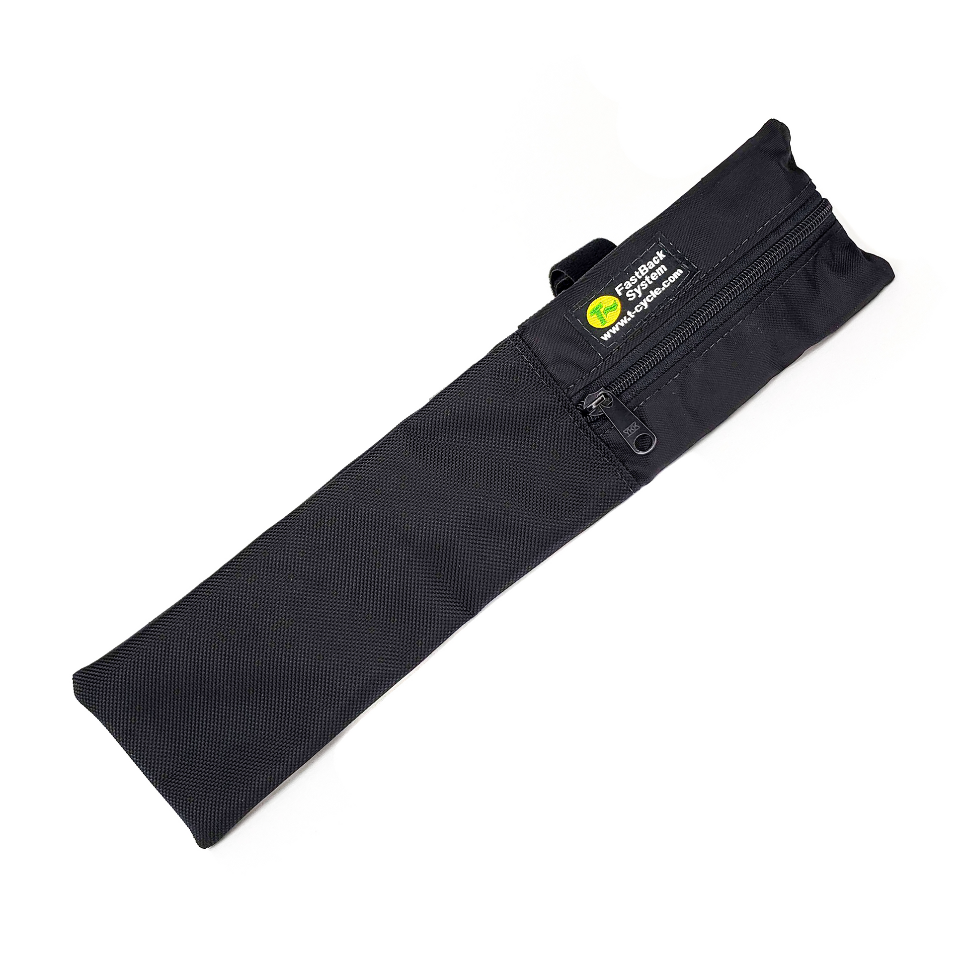 The Pump Pack is 14.75in (37.5cm) long and 3.25in (8.25cm) wide. The zipper is 4.5in (11.4cm) long. It is designed to carry most mini pumps plus a patch kit.
