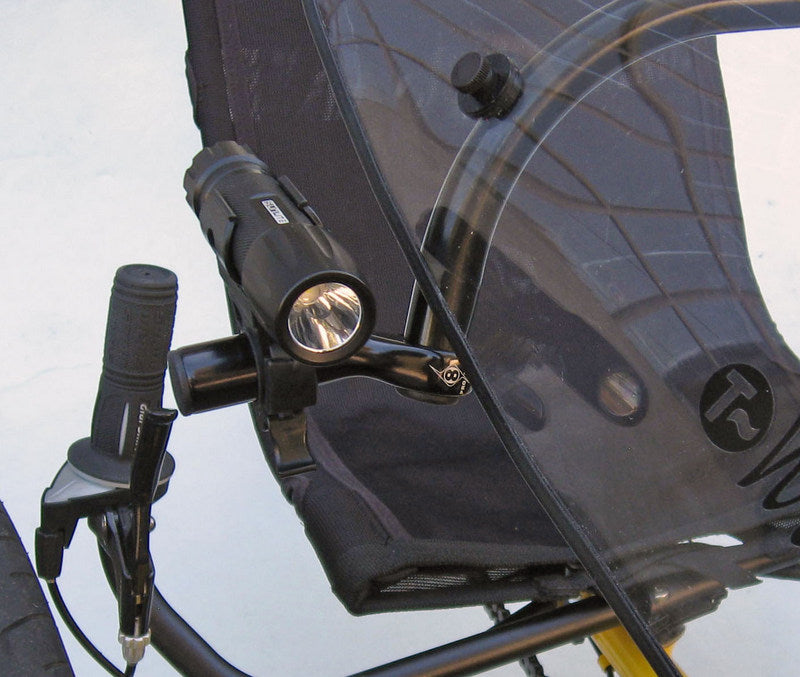 A Light Mount for WINTR Fairings lets you attach lights directly to the crossbar of your fairing. The mount clamps onto the end of the upper crossbar and provides 1.5" of space for attaching lights. This mount allows for left side, right side or dual side light mounting.