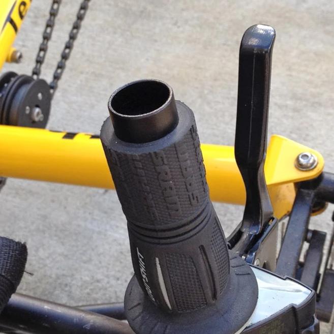 Cut off the end of the handlebar grip so 3/8 inch (10mm) of bare handlebar end is showing. This is fairly easily done if you wrap masking tape around the grip and cut along the line using a sharp knife.