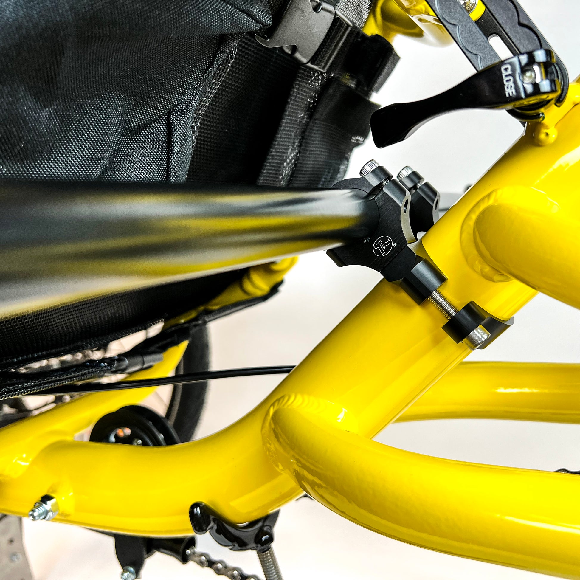 • The OneBolt Release option allows you to quickly and easily remove nearly everything for folding and/or transport. With 1-2 turns on a single collar clamp bolt, the main pieces slide out, leaving only the frame clamp and a short tube left on the trike. Reinstalling is just as easy, just slide the main part of the mount back in and tighten the one bolt. The OneBolt Release option replaces the Y clamps that hold the support tube to the Frame Clamp with larger ones and adds an intermediate slotted tube with a collar clamp. The intermediate tube is slotted at both ends to enable the double sided option.