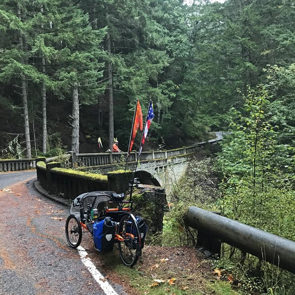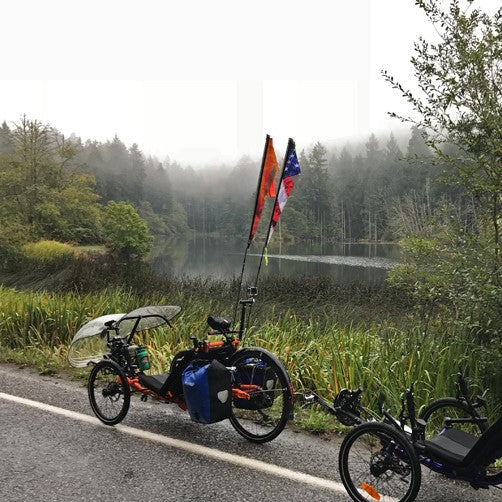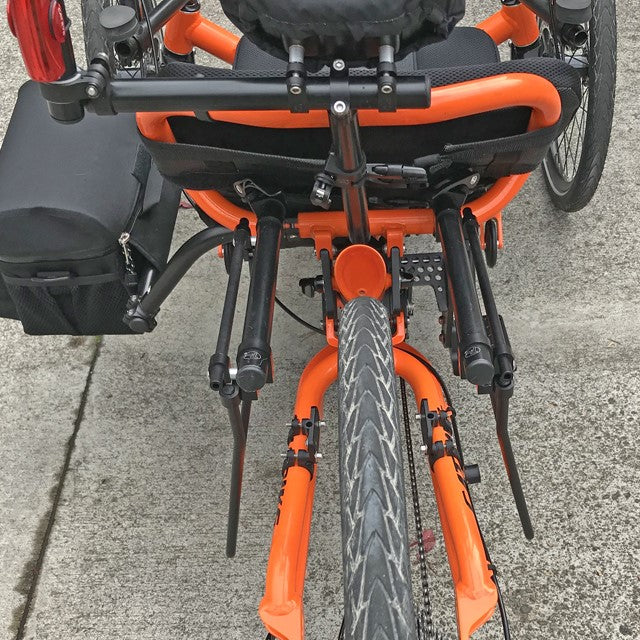 This rack is ideal for Catikes with suspension, but can also be used on Catrikes without suspension.  This rack clamps onto a sideways tube on the back of a trike seat, keeping the cargo weight of your panniers low and central, forward of the suspension element on suspension trikes. This preserves the go-cart-like handling that we all love about trikes.  Conventional racks are designed for conventional bikes and can hamper the handling of a trike, creating a wobbling sensation of the rear end.  It's high time that someone engineered a rack to suit the low center of gravity that makes trikes so fun to ride.