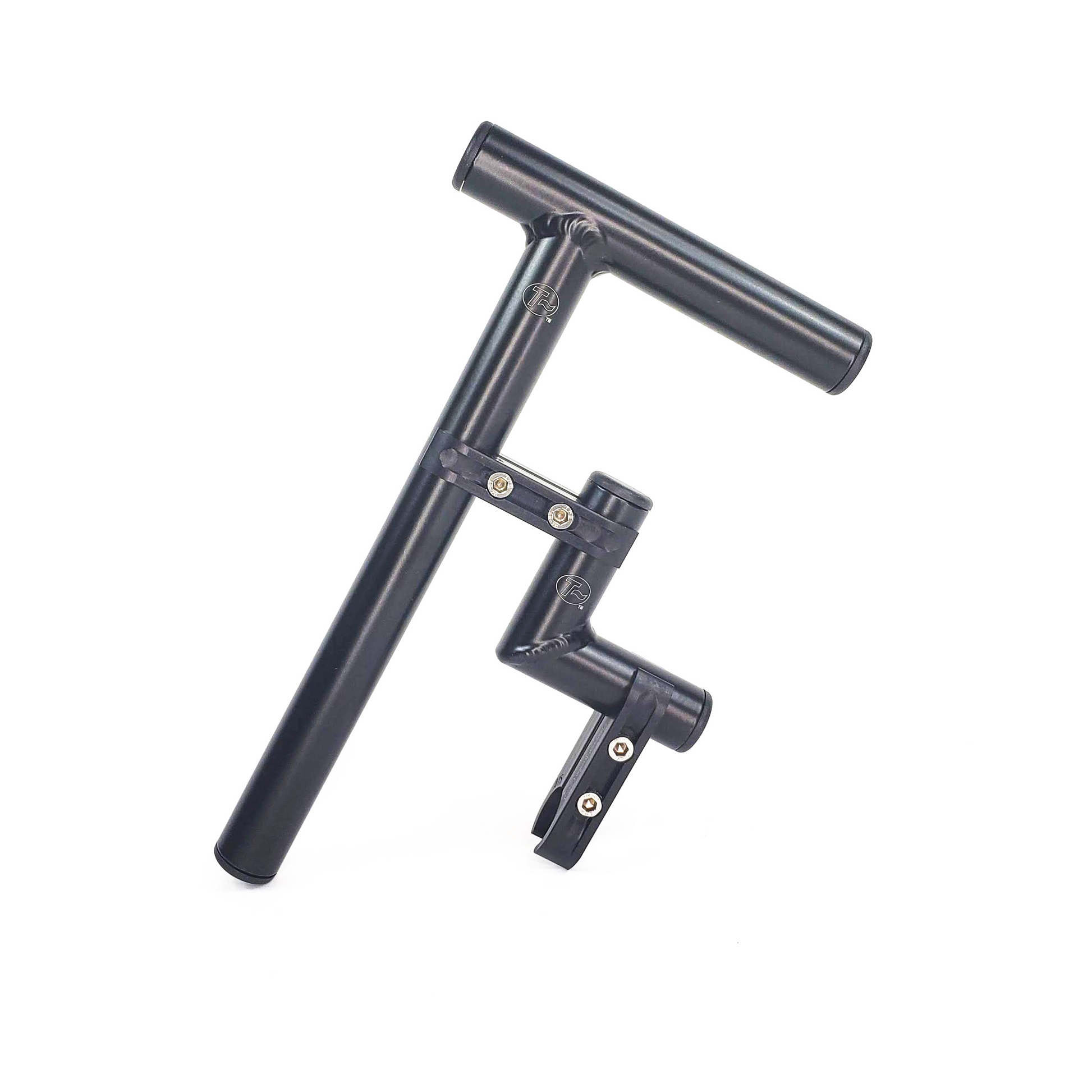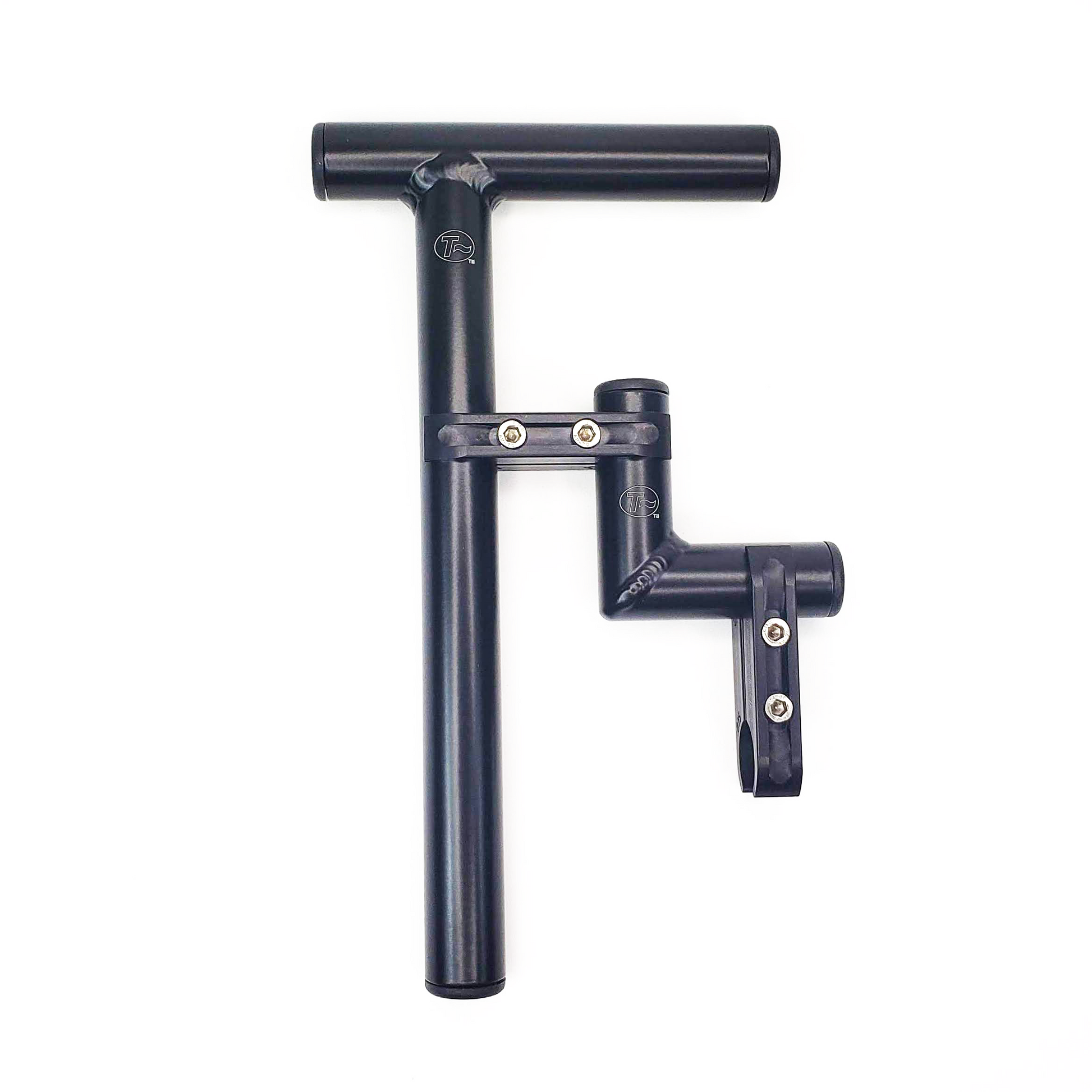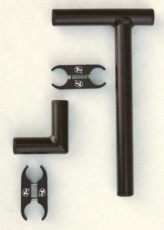 - A 90 degree elbow tube allows you to rotate the attachment clamp up or down on the horizontal steering arm. The 5in (125mm) wide T Bar attaches to the other side of the elbow tube. You can rotate the T Bar around on the vertical part of the elbow in order to move the T bar in and out.