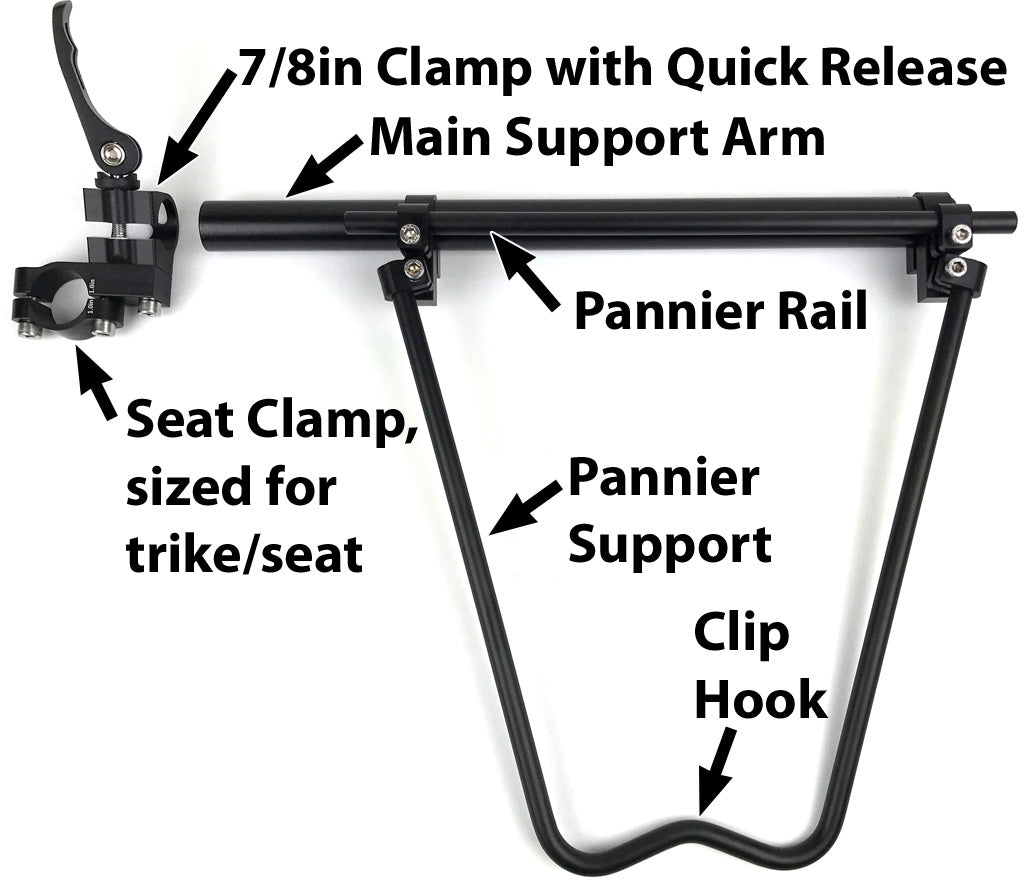 This rack features a quick-release that can be easily removed for travel and transport. Ride with just one side of the rack for short rides or commuting. Ride with both sides for longer rides, touring, or even grocery shopping. Easy to install and remove and transfer from trike to trike.