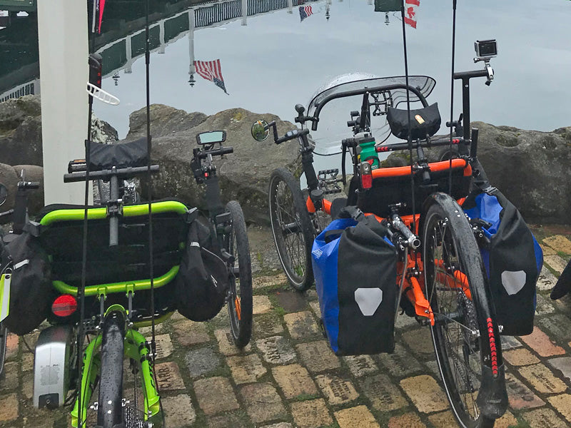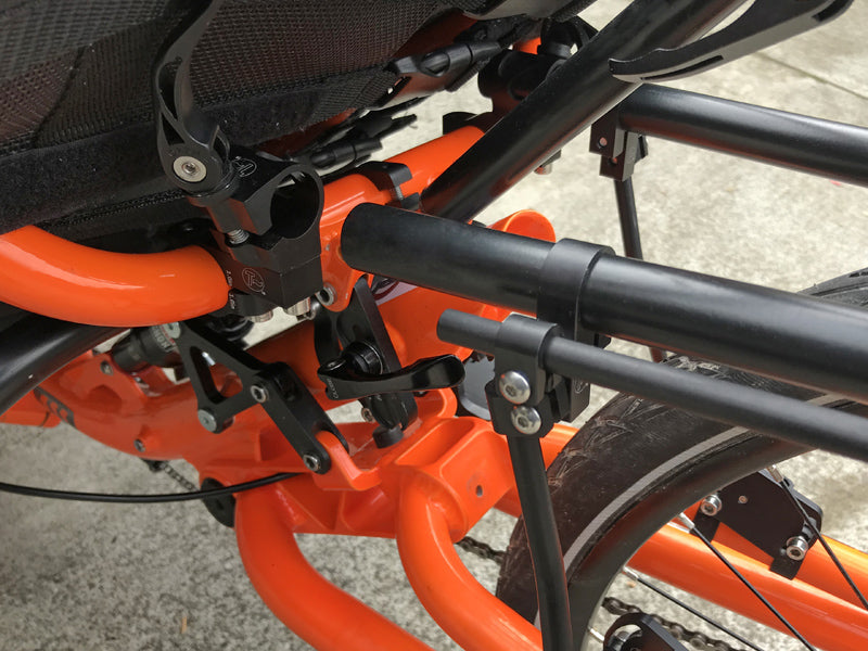 This rack clamps onto a sideways tube on the back of a trike seat, keeping the cargo weight of your panniers low and central, forward of the suspension element on suspension trikes. This preserves the go-cart-like handling that we all love about trikes. Conventional racks are designed for conventional bikes and can hamper the handling of a trike, creating a wobbling sensation of the rear end. It's high time that someone engineered a rack to suit the low center of gravity that makes trikes so fun to ride.
