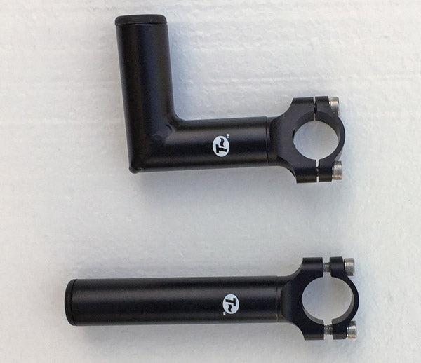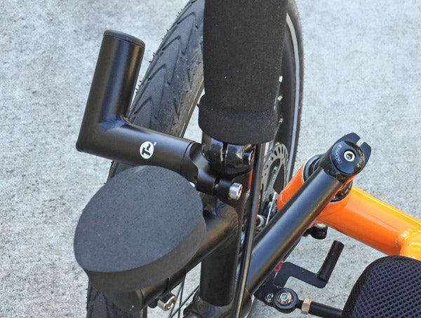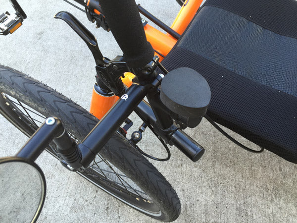 We found that a lot of trikers would like to mount accessories right below their hands. There often isn't much room on the handlebar to attach a mount, but there is usually at least a little bit of room between the grip and the brake, or right below the brake. We designed a new low profile clamp that only requires half an inch (about 12.7mm) of room. If you don't have that much room already, you can usually create it pretty easily. In order to maximize the versatility, we made the clamp so that it also clamps the accessory mounting tube from the inside. This means all sorts of tubular things can be attached, from ordinary straight tubes to bent or welded shapes. There are all sorts of possibilities. You are not limited to a mount with a particular shape or length, you can easily make things exactly the way you want them.